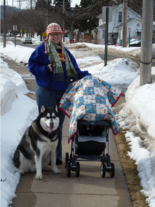 This week I went on my first walk. Mom was worried I would get cold, so she dressed me up in long-sleeves, pants, and then put this bear-skin jacket on me. Then she covered me up with a blanket.