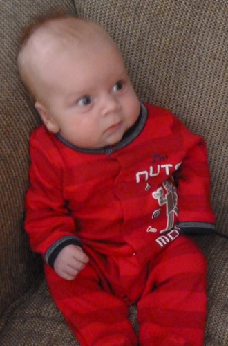 I like laying on the big bed. I am working on rolling over. I can get up onto my side, but I can't quite get all the way over - my arm gets in the way, and my head doesn't want to cooperate.