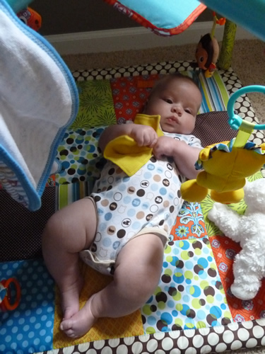 This week I rolled over a few times - Mommy and Daddy were excited about that. And they are a different kind of excited when I try to roll over during a diaper change. I also started playing with my crinkly paper this week - I like the noise it makes and it feels soft on my hands. But Gyro is still my favorite toy right now.