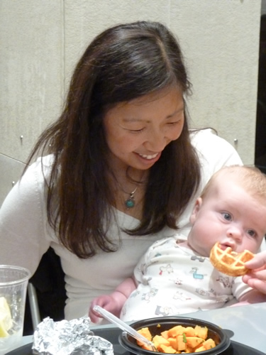 Jenny trying to feed me a waffle at lunch.