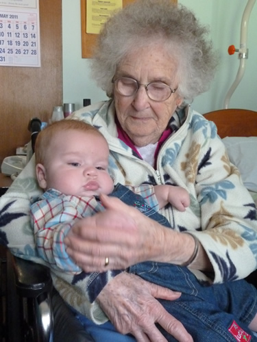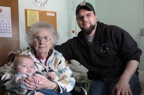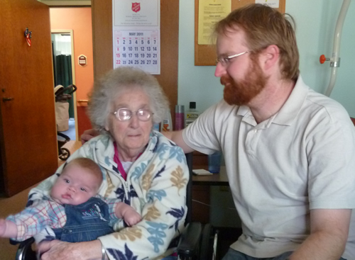 Since we were in Rochester, Daddy wanted to go see Great-grandma Dorothy. She is staying at a nursing home for a few days before she goes back to her house. Uncle Neil came with us. She didn't know we were coming - boy was she surprised!