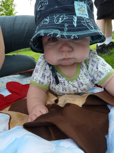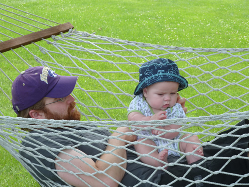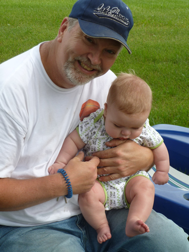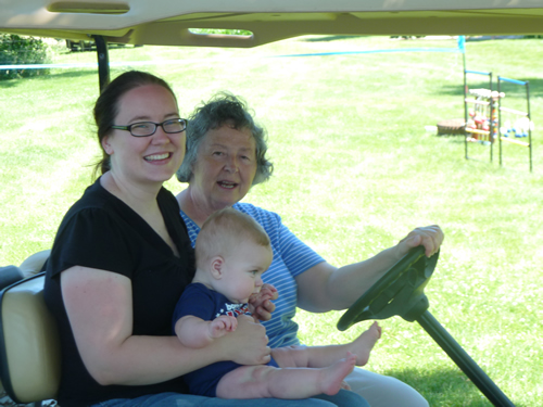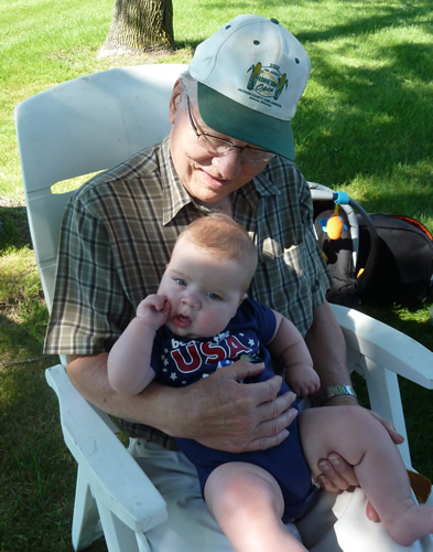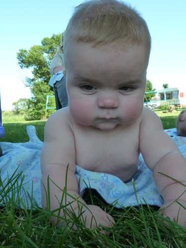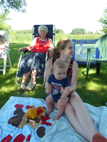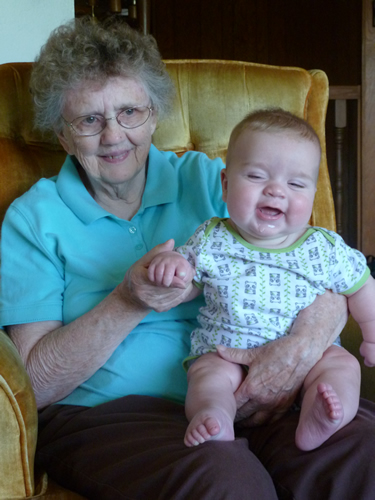 On Saturday we went west to visit family for the weekend. I saw Grandma Wynne for a few minutes when we dropped Duke off at her house, and then we went to see Great-grandma Muriel, Great-grandpa Les, Grandma Gail, and Grandpa Kevin. I slept most of the way, but we did have to stop for me to eat. Dad sat on the grass in the shade at a gas station and fed me.
