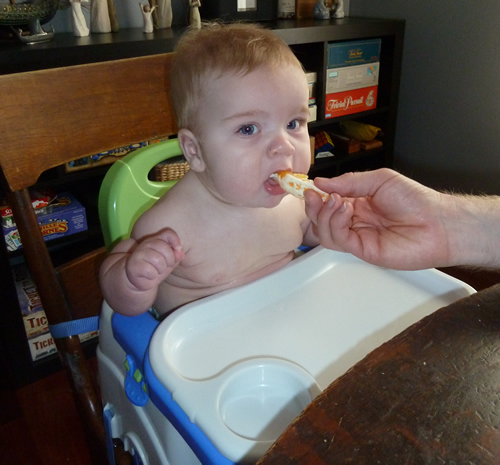 I've been doing much better eating solid food. Mommy and Daddy are happy they aren't just smearing it on my face. This week Daddy let me have a taste of the orange he was eating for breakfast.