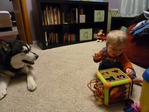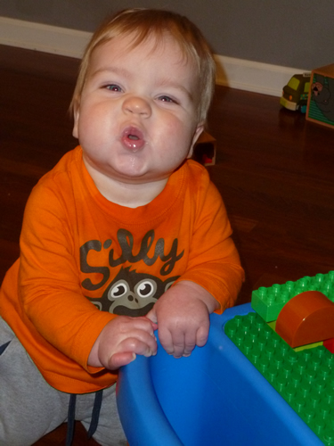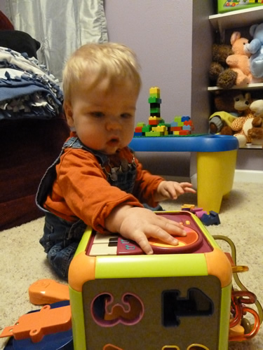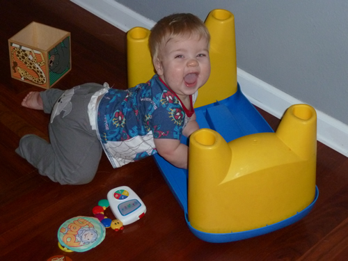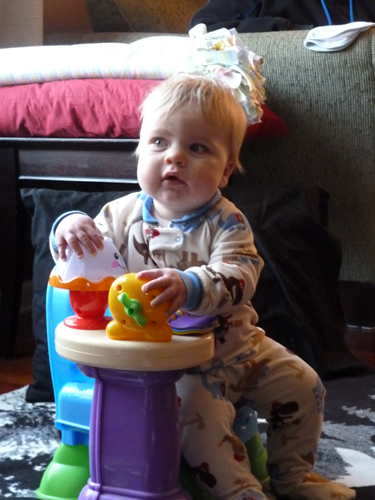 I love to play with stuff now that I can move around so well. Mommy puts out toys for me and I wander all over the dining room examining things.