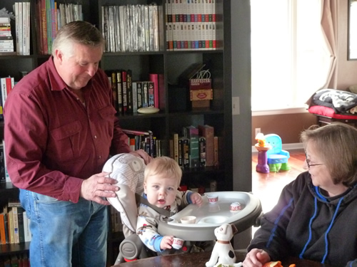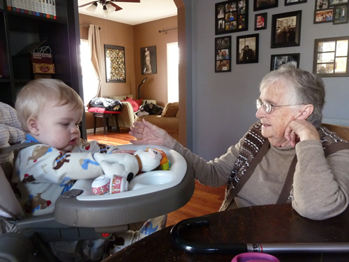 Mommy went to a meeting with Auntie Kara on Friday, so I stayed home with Daddy. Grandpa Al, Grandma Wynne, Great-grandma Dorothy, and Auntie Diane came to visit me for the day. We had lots of fun - I crawled all over, everyone got to hold me, and I even got to sit in my singing chair. Daddy was too busy visiting, so he didn't get a lot of pictures.