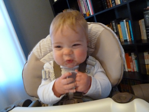 Very excited about something. Probably food, since I am sitting in my eating chair.
