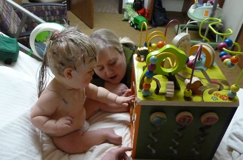 Auntie Kara explaining some of the features of the busy box to me.