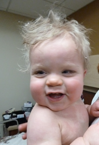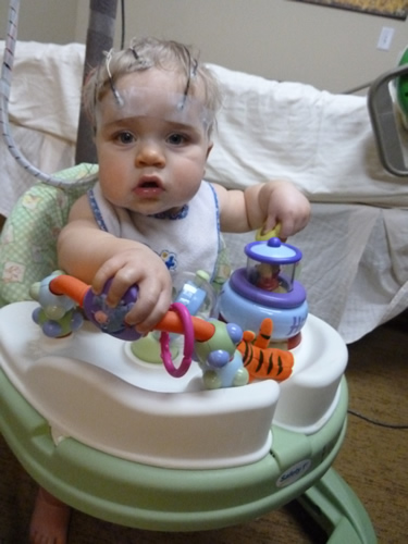 On Tuesday, I went to have another EEG - this one lasted SIX HOURS. Auntie Kara came along to help Mommy and Daddy keep me occupied. It wasn't so bad, I guess. I still had red marks and glue in my hair from last time, so Jaime didn't have to measure and mark up my head again. The only problem was that the glue wasn't sticking to my forehead, so Jaime had to tape the electrodes down. After all that, sitting around was a breeze. I even got a new toy - a big wooden busy box.