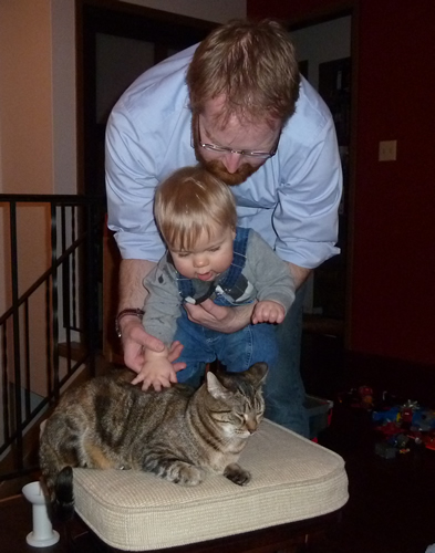 Petting a really small dog that doesn't bark. Daddy says it is a "cat."