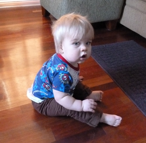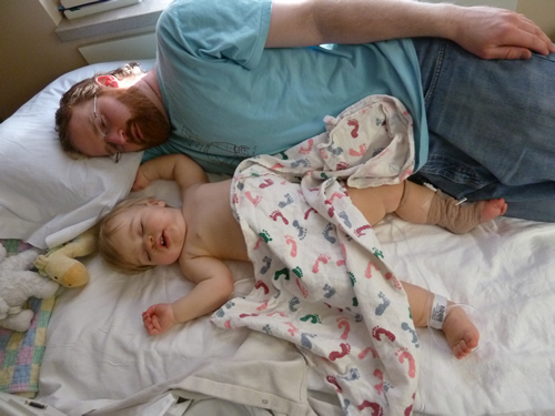 On Wednesday, I went to the emergency room because my temperature was high, I was coughing and not eating or drinking, and crying all the time. I had some more blood drawn and an x-ray. Turns out I had a fever, an ear infection, pneumonia, and I was dehydrated. The nice doctor gave me another shot, and squirted some medicine in my mouth. I was feeling and looking much better, so Mommy and Daddy took me home.