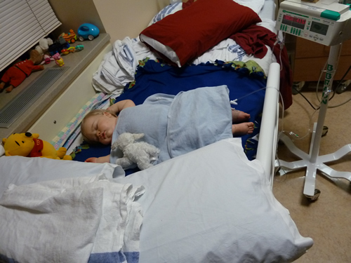 On Friday, very early in the morning, I had an IV put in. And a few hours later a nurse messed it up and I had to have another IV put in. That was not fun. Not fun at all. I didn't sleep much. Grandma Wynne and Grandpa Al came to see me. And so did Auntie Kara. I wasn't in much of a mood to play, though. Mommy, Grandma Gail, Grandma Wynne, and Auntie Kara all took shifts watching me (Grandpa Al stayed with Duke).