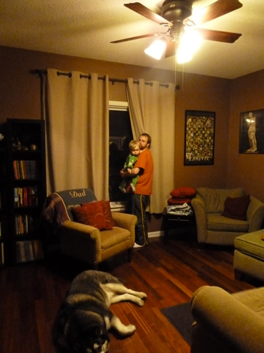 On Monday Daddy and I picked out some flowers to give Mommy for Valentine's Day. She really liked them. We were going to take a picture, but we forgot. We did get some pictures of me up late. Daddy took me to look out the window one night this week because I woke up screaming. Of course, you can't see much outside at 11:00 PM, so I decided to look at Duke instead.
