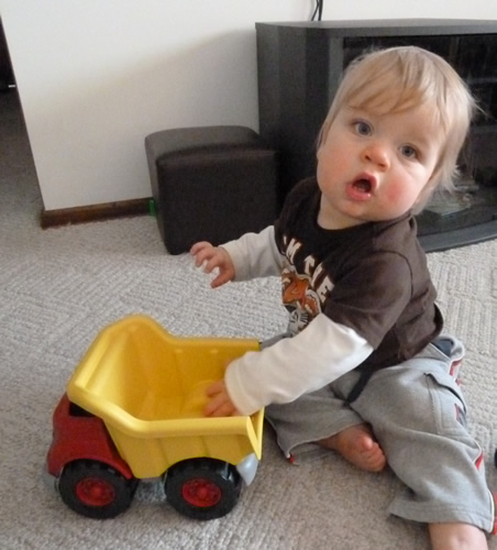 On Sunday afternoon, Daddy came back - and he brought me some toys! He brought me a dump truck and a blue race car and a teething ring and some plastic cups for me to drink out of. I love my new toys!
