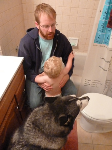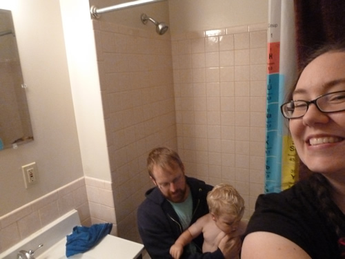 Here are some fun pictures: all of us in our tiny bathroom. The bathroom is actually so small that Mommy couldn't get the camera in a position that could take a picture of all of us at once, so there are two.