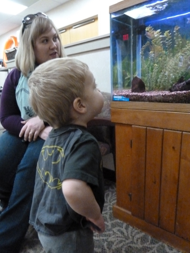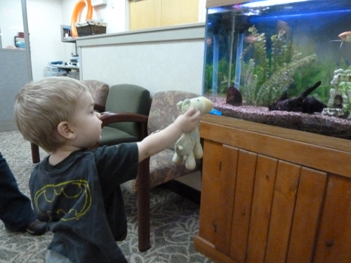 On Wednesday I had my MRI. Auntie Kara came down, even though we had a few inches of snow the day before (okay - we had ten inches, a few more than a few). Daddy woke me up at 3:30 AM so I could eat breakfast before 4 AM when I was supposed to start fasting. We watched The Lorax and played with my wooden building set. Then I was sleepy, so I took a nap. When I woke up, Auntie Kara was there and we had to get ready to leave. Auntie Kara sang songs with me on the drive to the hospital. We got to my appointment early so I had some time to investigate the waiting room.