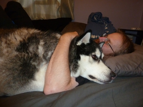 Daddy was tired after all the excitement so he was resting on the bed. Duke was jealous because we wasn't getting any attention, so he jumped on the bed with Daddy.