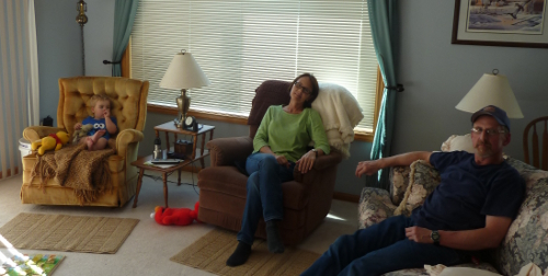 Relaxing with Grandma Gail and Grandpa Kevin.