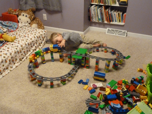 As promised, more LEGO action. Mommy and Daddy have ben competing to see who can make the most amazing train layout. Mommy did a figure-eight.