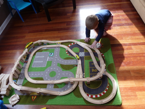 Mommy was doing some volunteering this week, so Daddy and I spent our time reading Curious George and playing. I brought out my wooden train set to go with my new blocks.