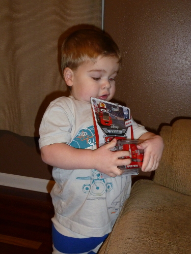 Everybody at school sang Happy Birthday to me, and after Mommy and Daddy picked me up at the end of the day, we went out for supper. I had a grilled cheese, french fries, and some pickles. Mommy and Daddy tried to get me to eat some lemon supreme pie for dessert, but I didn't want any. The servers at the restaurant also came out and sang Happy Birthday to me. After supper I got to open a card from Great-grandma Dorothy and one from Great-grandma Darlene. And I got a present from Mommy and Daddy.