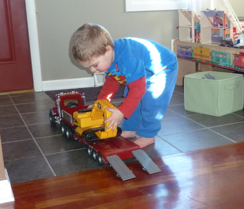 Mommy and Daddy were both doing some volunteer work on Saturday, so Grandma Wynne and Grandpa Al came to visit with me. We played with my trains and my blocks, we read some books and watched some Curious George, but we had the most fun with my excavator and my flatbed trailer. Daddy put new batteries in the excavator and Grandpa showed me how to get it to drive off the trailer all by itself. That was so exciting I had to do it again and again and again.