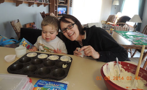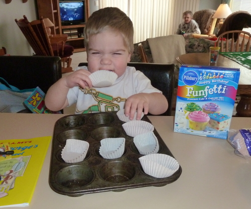 Saturday morning I went to Great-grandpa Les and Great-grandma Muriel's house to visit with them and Grandma Gail. GG had a present for me - a Curious George backpack! With a Curious George book in it! And we made cupcakes!