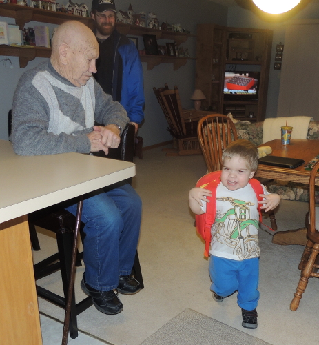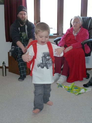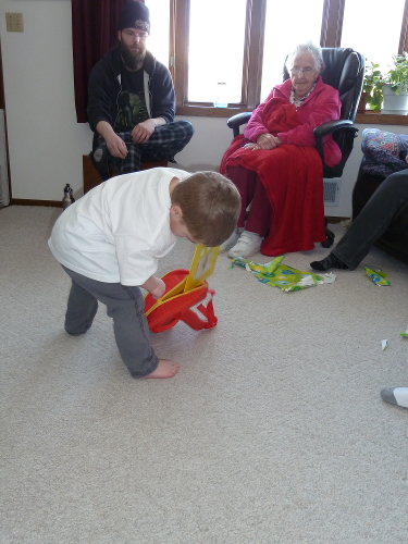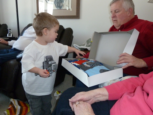 On Sunday, Great-grandma Dorothy, Diane, Milton, Bill, and David came over to visit. And they brought presents that were for my canceled birthday party from a few weeks ago.