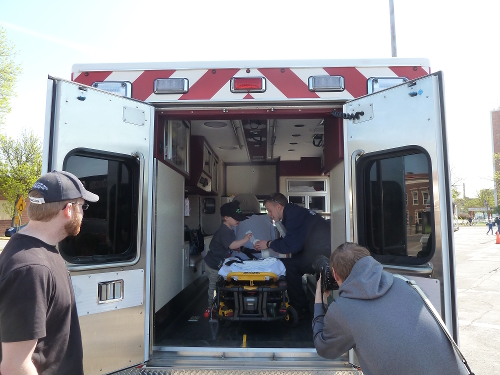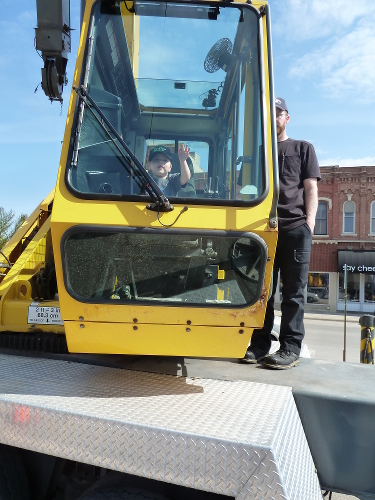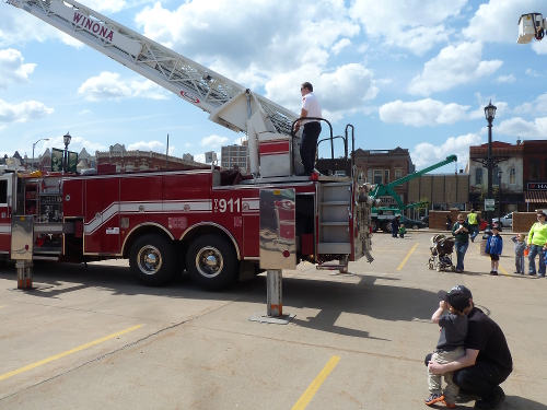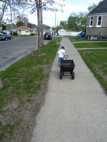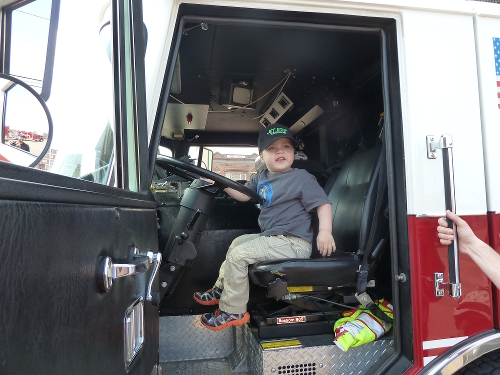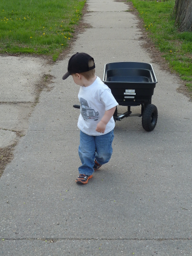 Running the remote control for the LEGO train. Hooking up the train cars. Saturday morning we went downtown to see some trucks. The public parking lots downtown had trucks parked in them and I got to sit in almost all of them! And honk their horns! No foolin' - and no one got mad at me for honking the horns, either (even the air horns). I also got to go in a bouncy house for the first time. It won't be the last. In the crane truck, with Daddy standing by. Driving the bus. In the bouncy house. Ready to go down the bouncy house slide. Checking out the Peterbilt milk truck with Daddy. Some of you may have seen my picture in the paper - here is a picture Mommy took of me getting my picture taken by the newspaper photographer (he's on the right - the guy on the left is Daddy). In the ambulance, getting my picture taken for the local paper. And this is the picture of me on the website - I don't know yet if I made the print paper. The picture from the non-Mommy photographer. Back to trucks... Watching the ladder truck with Daddy. Sitting in the fire truck. Mommy tried on the fireman hat. Driving the orange snow plow truck. After some dinner and a nap, we went to visit our friends Rosa, Bonnie, and Adam. I played with Rosa while Mommy and Daddy talked. And talked. And talked. I played with Mommy on Sunday morning while Daddy went in to work for a few hours. I rode my bike and went to check out the excavator a block from my house (I've been checking up on it a couple of times a day all week). We found out a new house is going to be built on the spot where the old house was torn down last week. Daddy watched me in the afternoon while Mommy studied for a test. We spent the time outside - we went for a walk with the wagon and I went down a big slide and then played in a sandbox with my friend Maggie. Then we took Duke for a walk. Here are a couple of pictures from my wagon trip. I persuaded Daddy to let me pull the wagon. Pulling my wagon. Off we go... Right after the second picture was taken I fell down and scraped my elbow. I didn't even notice it until Daddy grabbed my arm to take a look at it - I just got back up and started pulling the wagon again. And that was it. Daddy says we get to go to Bob and Jenn's house in a little over a week. But I don't know what a week is.... Hopefully it's not too long. Take care!