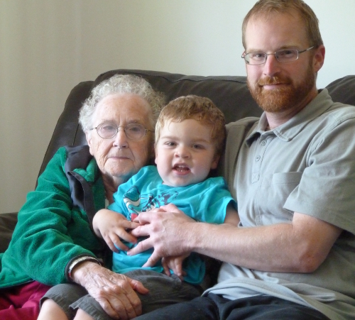 Sunday was Grandpa Al's birthday. I sang to Happy Birthday to him. And Great-Grandma Dorothy, Auntie Diane, Uncle Milton, Uncle Bill, and Uncle David all came over for a little while. Daddy even managed to get me to sit still for a picture with Great-grandma Dorothy. And Daddy took a picture without me, too.
