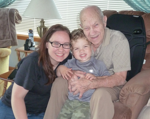 For the weekend, we left Daddy home with Duke and went to Great-grandpa Les and Great-grandma Muriel's house. We played with GG there, and Auntie Nancy came to visit. Mommy and I had a lot of fun.