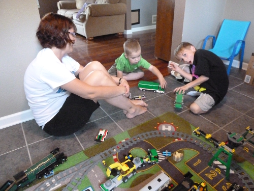 Showing Angie and Sawyer my trucks and trains.