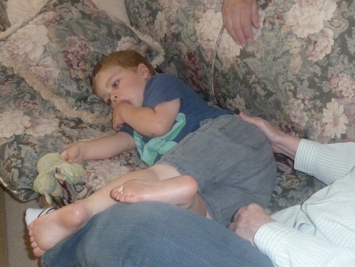 Falling asleep at Great-grandpa Les and Great-grandma Muriel's house.