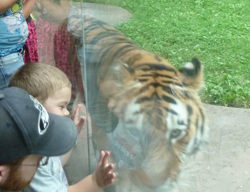 The first time we went to the tiger lair the tiger was sleeping. The second time he was walking back and forth in front of the glass.
