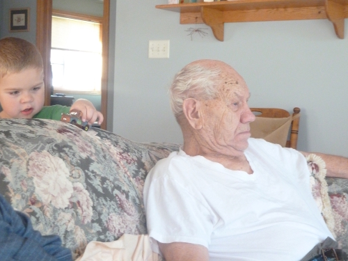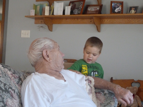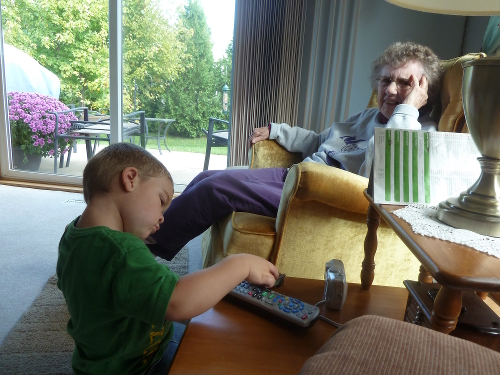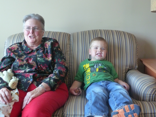 Sunday morning I watched cartoons with Grandpa Al and Grandma Wynne. After lunch we went visiting, first to see Great-grandma Dorothy in her tower. Auntie Diane and Uncle Bill were there as well.