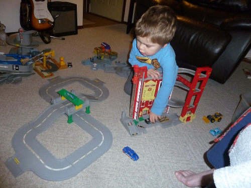 On Thursday we went to Grandpa Al and Grandma Wynne's to stay for a few weeks. Mommy and I are off of school, and Daddy has to work. We are going to have some fun and go visiting (weather permitting). Plus, we have a few Xmas parties to go to. But before all that, Mommy got out some Hot Wheel toys that Michael and Nancy gave me and we put some roads together for me to play with - that was a lot of fun (once we figured out how to get everything connected).