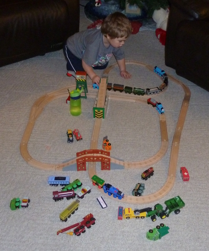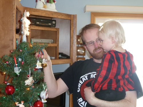 Mommy and I are still staying with Grandma Wynne and Grandpa Al. I put some more ornaments on the tree, and we went out for lunch at the train restaurant and the owner let me blow the train whistle!