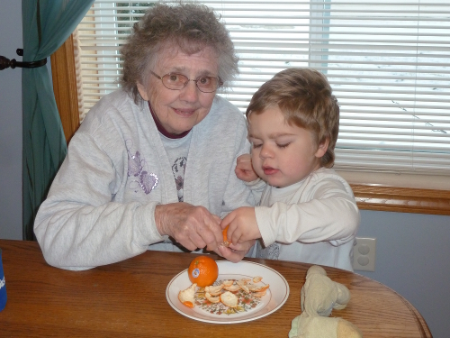 Asking Great-grandma Dorothy if it was time to open presents yet.