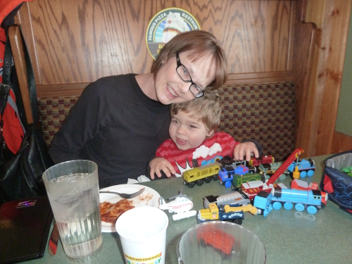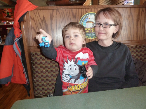 We went out for lunch with GG and Grandma Wynne at the train restaurant.