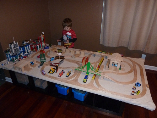 On Sunday Mommy had to study for school, so Daddy and I played all day. We worked on my train tracks and built the Steam Works, Tidmouth Sheds, and the Diesel Works out of my blocks.