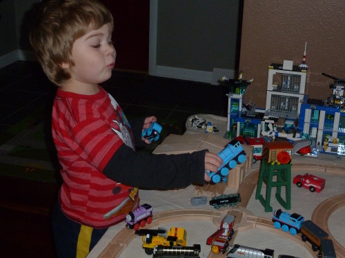 This week was my birthday week - and keeping with tradition I got sick (see my birth with jaundice, first birthday with pneumonia, and second birthday with RSV - last year was the only healthy one). The night before my birthday my tummy was angry and I was sick. And that meant I had to stay home from school and miss the Winter Dance Party. Daddy and I stayed home and built my LEGO police station on Thursday (we built the fire station I got for my birthday on Monday). And we stayed home on Friday because I still wasn't feeling well, and we played with my trains.