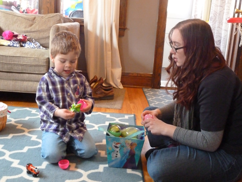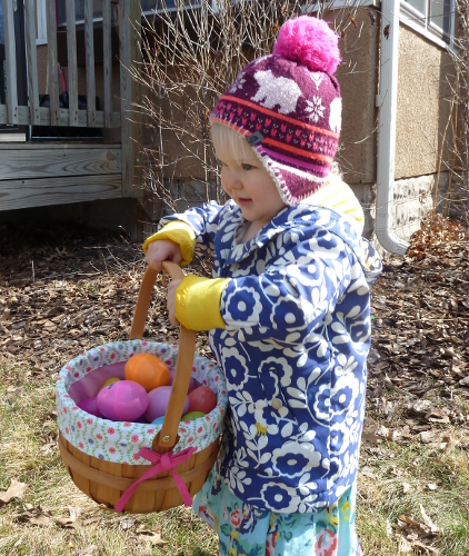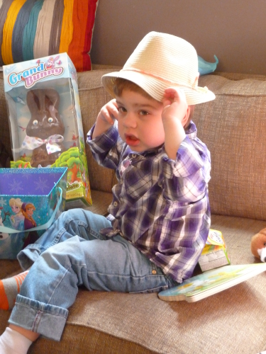 Before lunch we got some Easter presents, and then we went out to find Easter eggs! Then we opened the eggs and I found trains and lots of money!