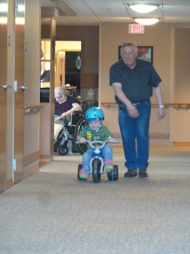 Sunday morning we went to visit Great-grandma Dorothy. We saw Uncle John because he was there visiting too. I brought my trike and wore my new helmet. I was riding really fast, but I didn't run over anyone. Daddy says it may be my last time riding in the tower, however, since I didn't listen very well.