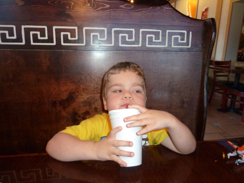 On the way home we stopped for lunch. I drank a lot of water. And Mommy taught me how to make the straw wrapper fly off.