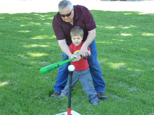 All right, Grandpa, this is how you hit the ball...