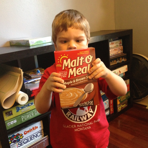 Checking out the box of "Special Oatmeal."