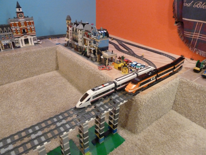 My LEGO trains on the new two-track bridge Daddy and I built.
