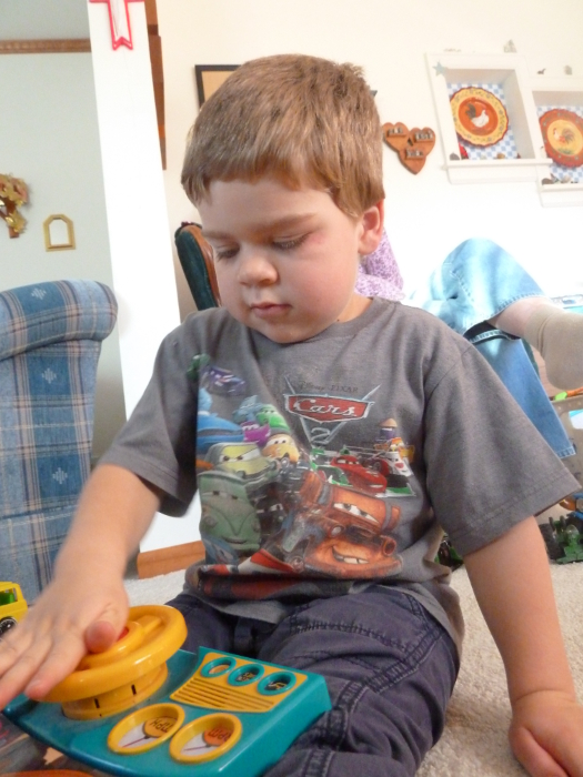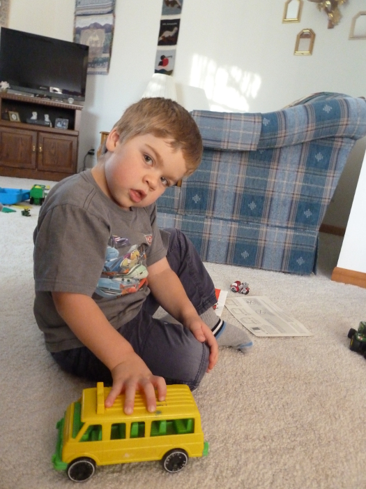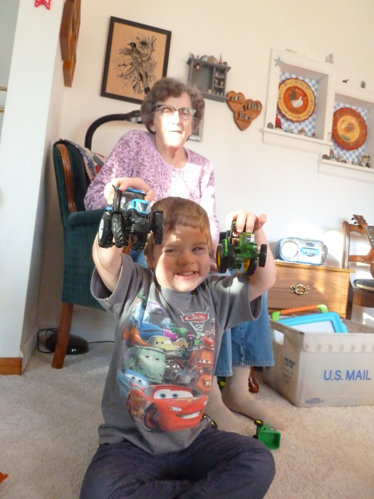 We let Mommy have the weekend off and went visiting. We went to see Great-grandma Darlene at her house. Daddy and Grandpa fixed her sewing machine while I tried to get Max to play with me. Max was more interested in watching television, so I had Great-grandma's toys all to myself. Well, except for when Daddy was trying to play with them, too.