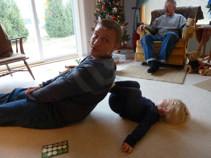 Great-grandpa Les has a lot of tractor ornaments to find on the tree.