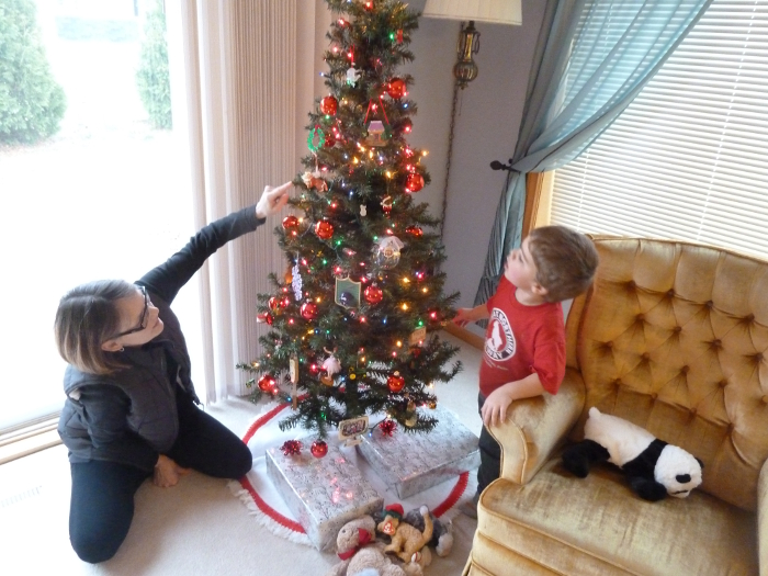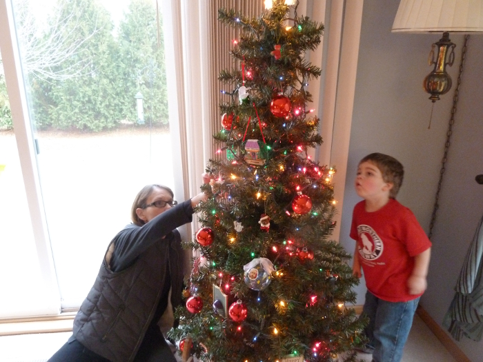 Checking out the Christmas tree with GG.