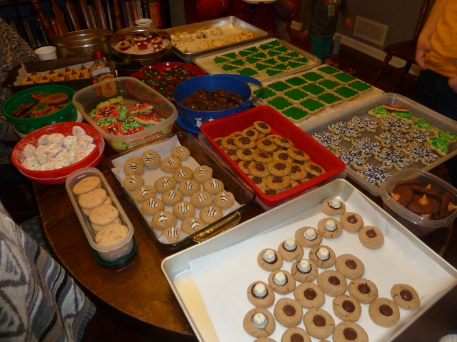The table full of cookies the mommies of all those kids in the LEGO room made.